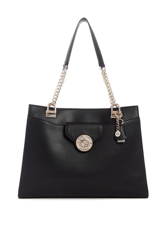 Introducing your new obsession, our Black Belle Isle Society Carryall is the ultimate everyday bag! A modern black satchel with a stylish chic appeal, featuring chain shoulder straps, all-over grain pattern, removable key charm set in gold tone hardware and multiple interior compartments to separate and store your essentials.