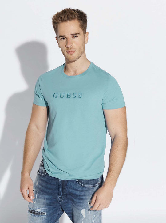 GUESS Mens Blue Pima Logo Crew Neck Tee    M82P64R7HD0 Front View GUESS Mens Blue Pima Logo Crew Neck Tee    M82P64R7HD0 Full  View GUESS Mens Blue Pima Logo Crew Neck Tee    M82P64R7HD0 Detail View GUESS Mens Blue Pima Logo Crew Neck Tee    M82P64R7HD0 Back View