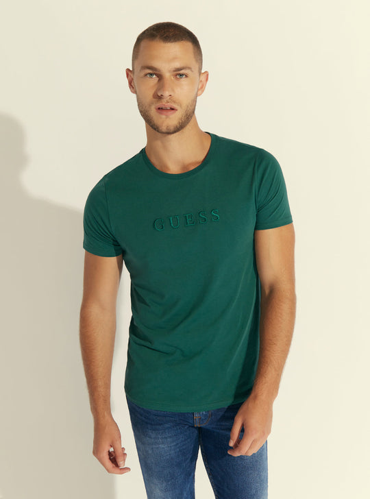 GUESS Mens Dark Green Pima Logo Crew Neck Tee M82P64R7HD0 Front View GUESS Mens Dark Green Pima Logo Crew Neck Tee M82P64R7HD0 Full View GUESS Mens Dark Green Pima Logo Crew Neck Tee M82P64R7HD0 Detail View GUESS Mens Dark Green Pima Logo Crew Neck Tee M82P64R7HD0 Back View