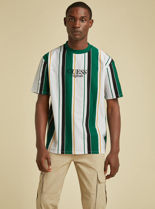 GUESS Mens GUESS Originals Green Multi Jake Striped T-Shirt M1BI02KAGP0 Front View GUESS Mens GUESS Originals Green Multi Jake Striped T-Shirt M1BI02KAGP0 Back View